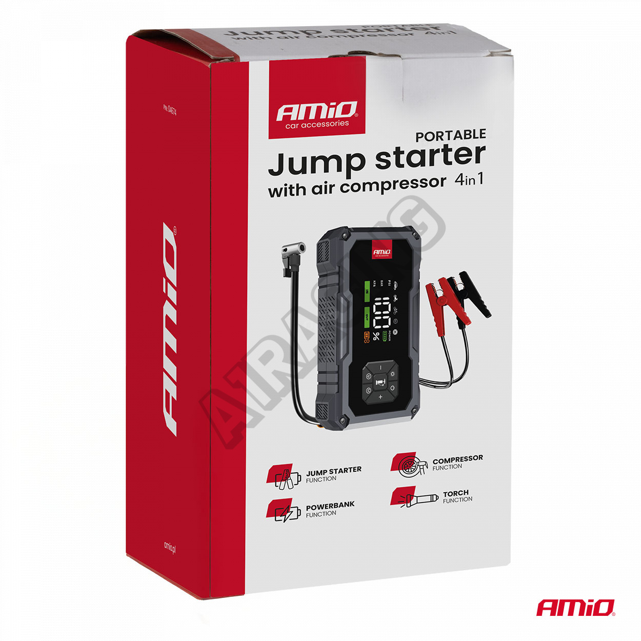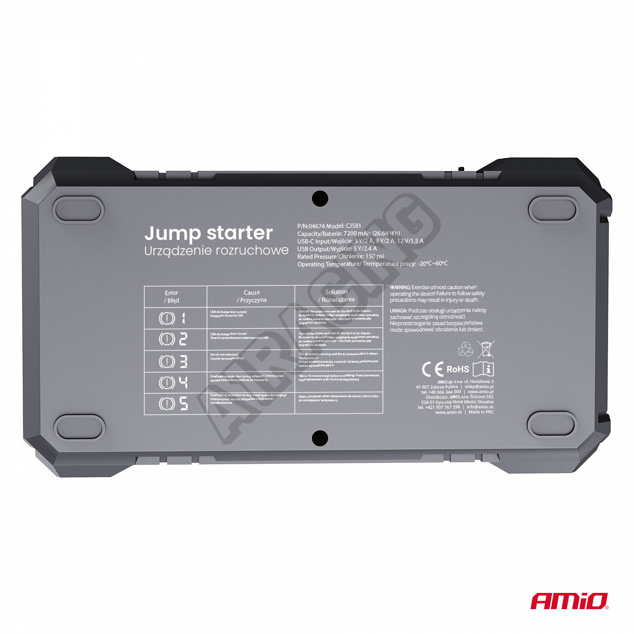 Das Starthilfegerät AMiO 4in1 ist ein multifunktionales Gerät, das für Werkstätten, Servicebetriebe und Einzelanwender konzipiert ist. Es kombiniert die Funktionen eines Starthilfeboosters, eines Luftkompressors, einer Powerbank und einer LED-Taschenlampe, was es zu einer zuverlässigen Lösung in Notfällen und im täglichen Gebrauch macht. Technische Spezifikation: Spannung: 12 V Akkukapazität: 7.200 mAh (Lithium-Ionen) Startstrom: 300 A (max.) 600 A) Eingang Type-C: 5V/2A, 9V/2A, 12V/1.5A USB-Ausgangsanschluss: 5V/2.4A Kompressor: max. Druck 150 PSI (10 bar) Zylinderdurchmesser: 19 mm Luftleistung: 25 L/min Pumpenleistung: 100 W LED-Taschenlampe mit drei Modi: Dauerlicht / SOS / Stroboskop Gehäusematerial: robustes ABS + PC Abmessungen: 200 × 108 × 50 mm Wichtigste Vorteile: Zuverlässiger Start von Motoren in Pkw und leichten Nutzfahrzeugen Leistungsstarker Kompressor ermöglicht schnelles Aufpumpen von Reifen, Bällen, Matratzen oder Campingausrüstung Powerbank-Funktion mit Schnellladung ermöglicht das Aufladen von mobilen Geräten unter allen Bedingungen Kompakte Abmessungen und robustes Gehäuse sorgen für bequemen Transport und Langlebigkeit Eingebaute Schutzvorrichtungen gegen Kurzschluss, Überlastung und Verpolung gewährleisten Arbeitssicherheit Das Produkt erfüllt alle erforderlichen Qualitäts- und Sicherheitsstandards Anwendung: Das AMiO 4-in-1-Gerät ist die ideale Lösung sowohl für professionelle Werkstätten als auch für Privatkunden. Dieses praktische und multifunktionale Werkzeug erhöht den Komfort und die Sicherheit beim Fahren.