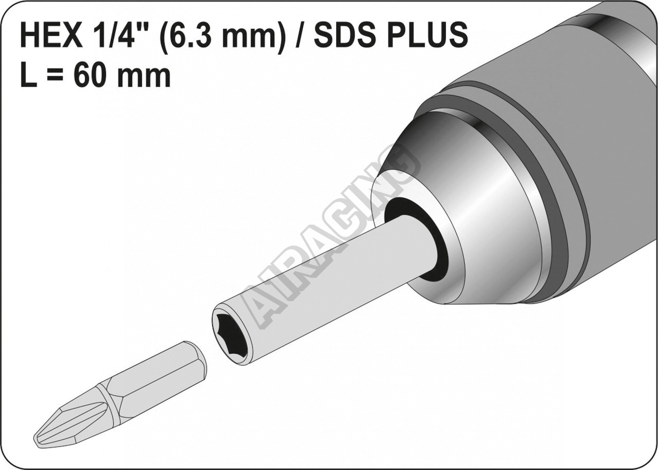 Adapter für SDS-plus-Bohrer mit HEX-Ende zur Möglichkeit der Verwendung von Bits.