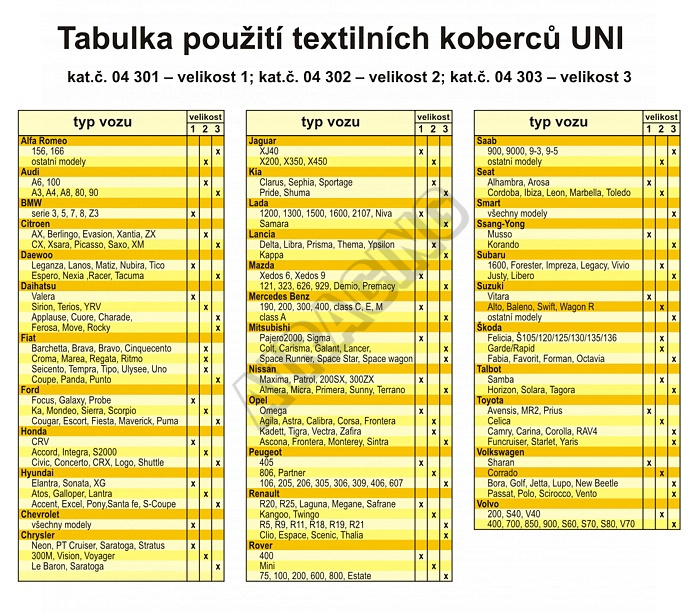 Universelle textile Autoteppiche. Die Fotogalerie zeigt eine Tabelle der grundlegenden Fahrzeugtypen, auf denen Teppiche verwendet werden können. Set bestehend aus 4 Teilen (2x Vorderteil, 2x Hinterteil).