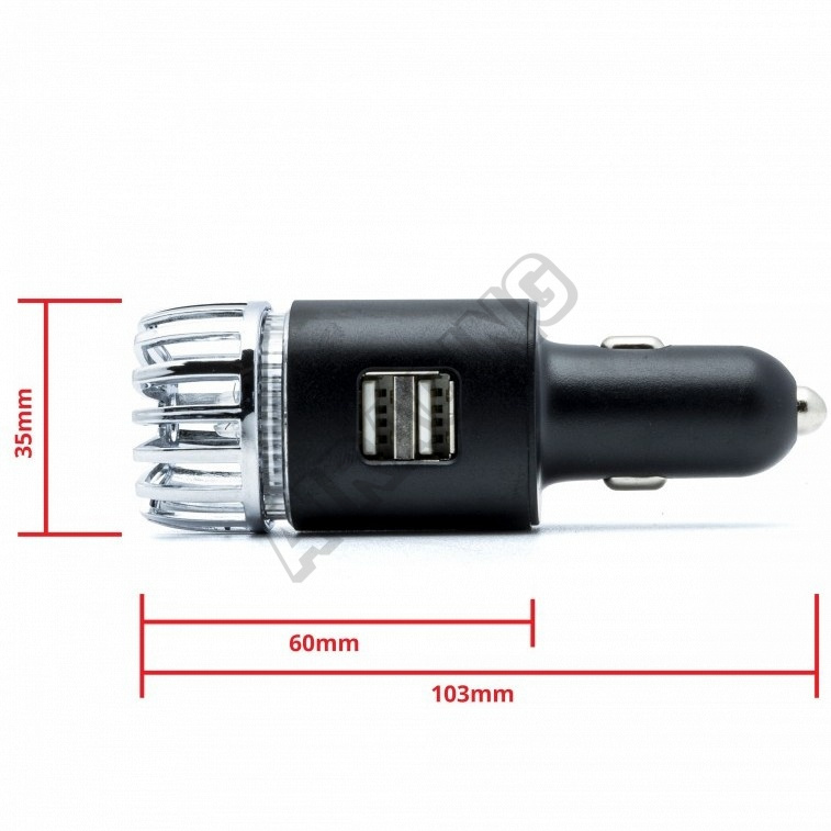 Technische Daten: Ladeanschlüsse: 2x USB Spannung (Eingang): DC 12 V/1,25 A, DC 5 V/2,5 A LED-Hintergrundbeleuchtung Maximale Ladeleistung: 2,5 A Negative Ionenkonzentration: 5.600.000 Stück/cm3 Ozonkonzentration: ≤ 0,05 ppm Stromverbrauch: 0,8 W schwarze Farbe Abmessungen: 35 x 35 x 105 mm Gewicht: 40g