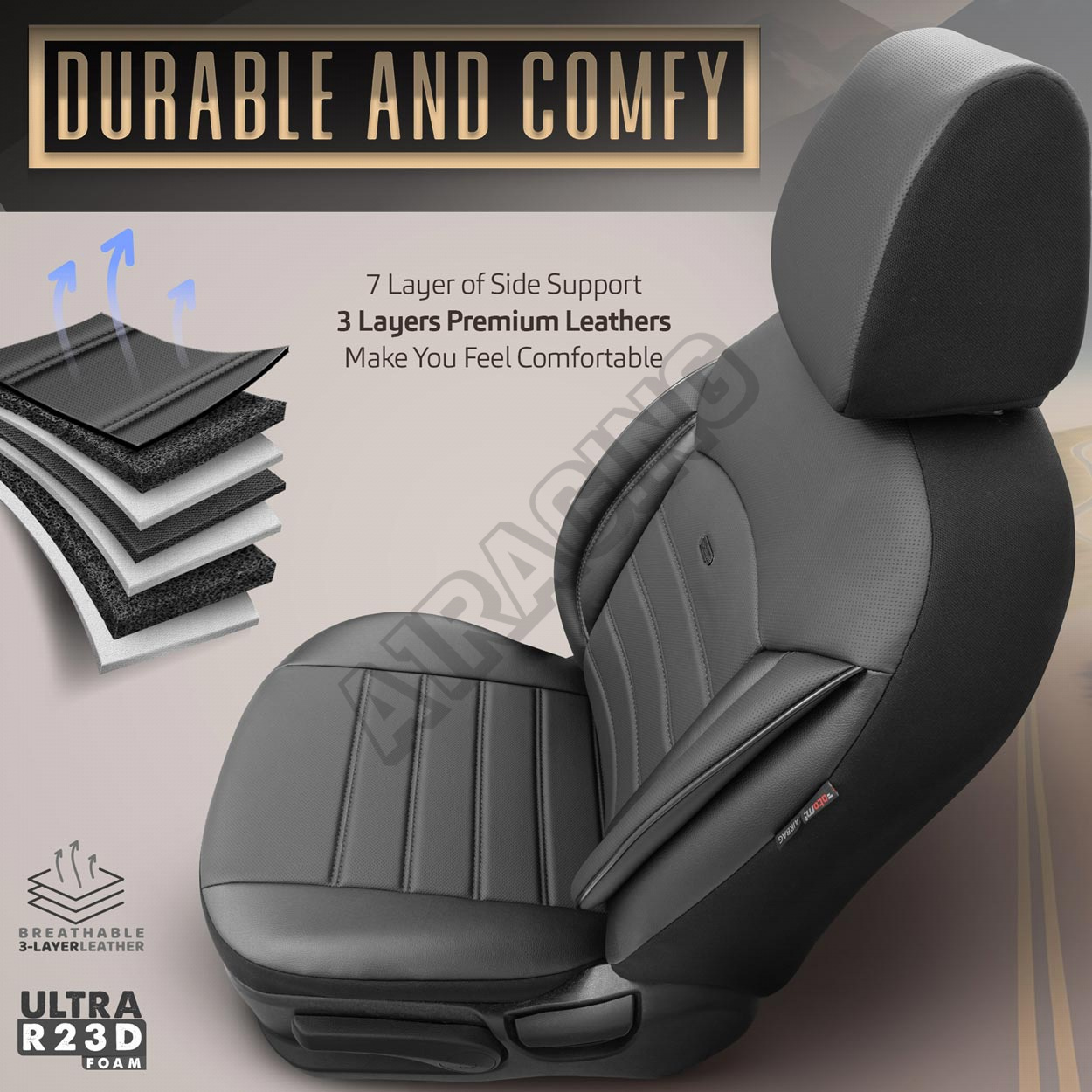 Die Kombination der besten Materialien und die hohe Sorgfalt bei der Ausführung gewährleisten ein exklusives Aussehen und eine außergewöhnliche Haltbarkeit sowie einen hervorragenden Schutz der Sitze vor Verschmutzungen und Abnutzungen.Die Bezüge verfügen standardmäßig über eine zertifizierte AIRBAG-Naht, wodurch sie sowohl für Autos mit seitlichen Airbags in den Sitzen als auch für Standardsitze geeignet sind.