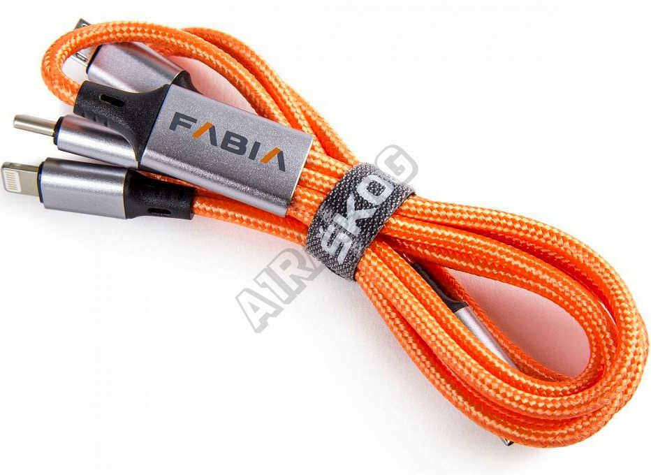 USB-Ladekabel 3 in 1 mit FABIA-Branding. USB-C-Anschlüsse und drei Kombinationen aus Micro-USB, USB-C und Lightning. Länge 80 cm.