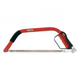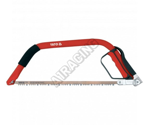 Solide verarbeitete Bogensäge aus rot lackiertem Stahlprofil, ausgestattet mit einem ergonomischen Griff, der ein Abrutschen der Hand und mögliche Verletzungen verhindert, außerdem ist der Griff sehr komfortabel.
