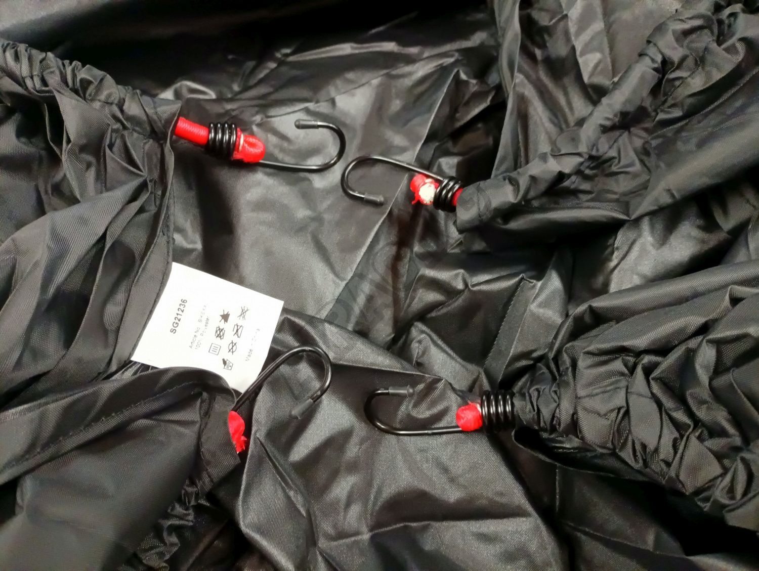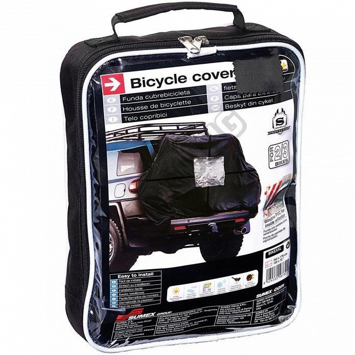 Die Gesamtlänge beträgt 347 cm. Die Plane bedeckt alle Fahrräder und verfügt oben und unten über Gummibänder mit Haken zur Fixierung.