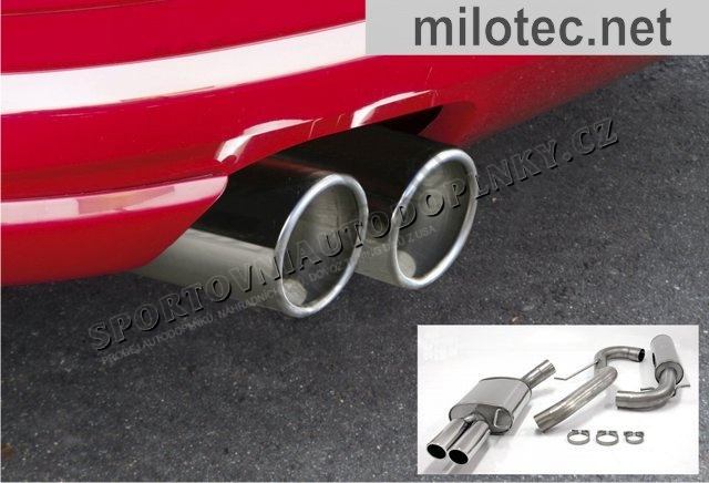 Kompletní sportovní výfukové potrubí (za KAT) se skládá z předního tlumiče, mezipotrubí a koncového tlumiče s dvojitým zakončením o průměru 2 x 76 mm, součástí balení je upevňovací sada. Montáž doporučujeme svěřit odbornému servisu.